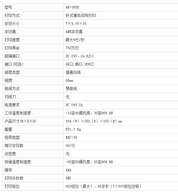 AB-300K打印機具有優美的外觀。結構設計合理,整個打印機與控制板模塊化設計更易于維護。 內部空間緊湊,有效降低了打印時震動引起的噪音。 打印速度快,黑標定位,定長打印。 自帶中文字庫,支持單、雙、三聯打印。 高穩定性、提供串行、并行、USB等多種接口。 支持58mm/76mm兩種紙寬打印。 支持WINDOWS圖形打印。